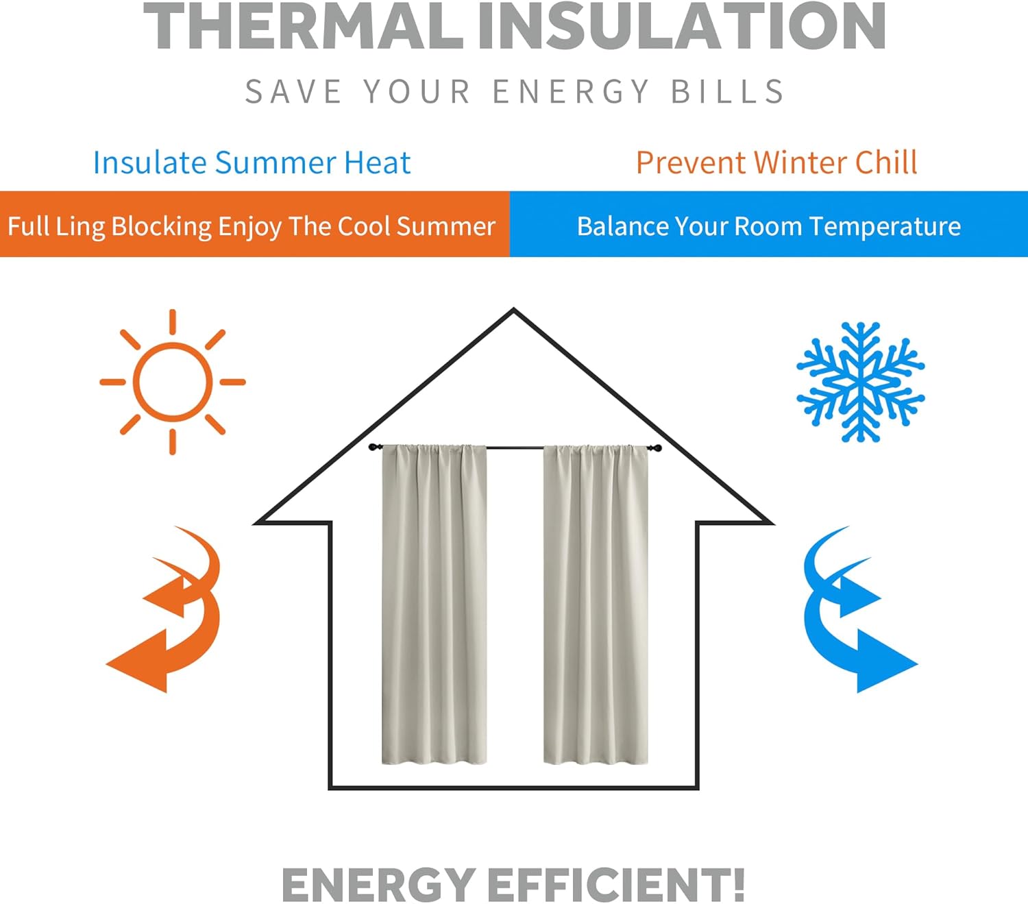 - ENERGY SMART - Curtains are work well on balance the temperature inside and outside by insulating summer heat and winter chill, so that these room darkening curtains can reduce the energy waste and save the daily bill effectively.