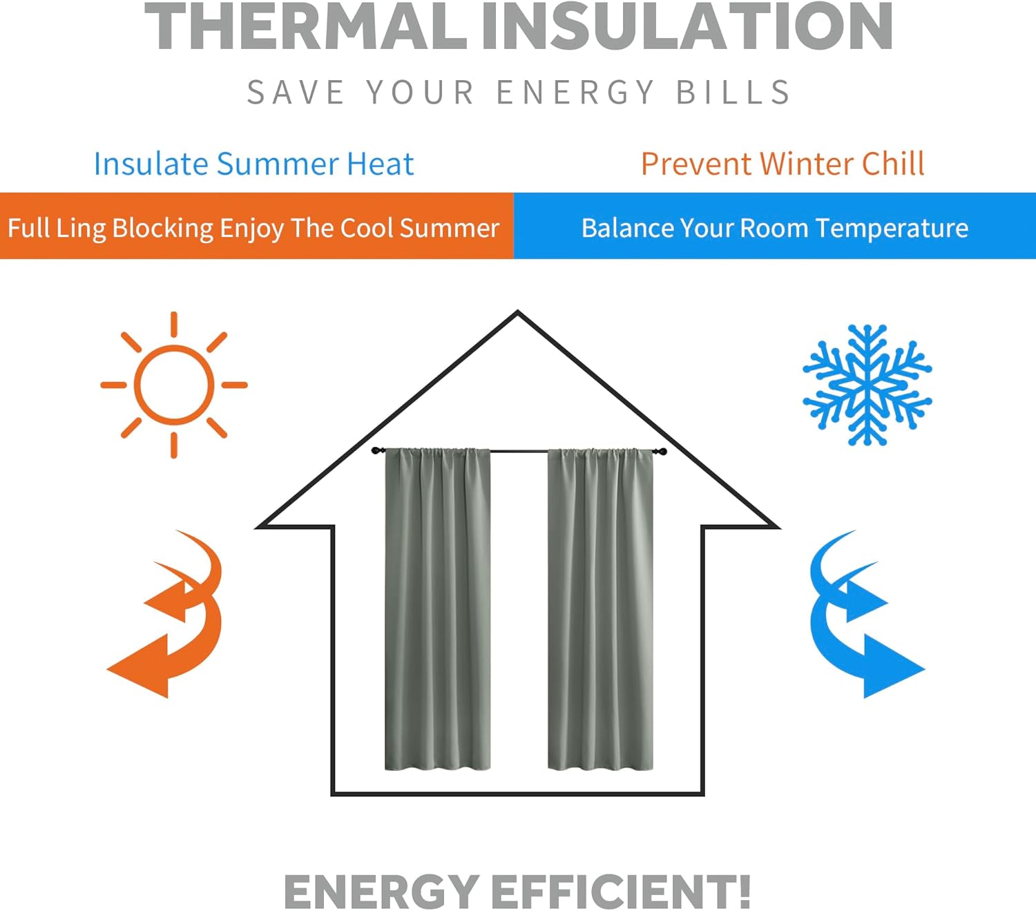 - ENERGY SMART - Curtains are work well on balance the temperature inside and outside by insulating summer heat and winter chill, so that these room darkening curtains can reduce the energy waste and save the daily bill effectively.